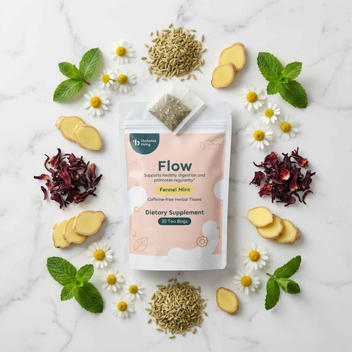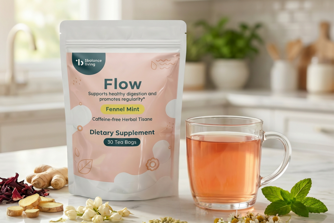 Unlike traditional black or green teas, Flow is a caffeine-free botanical tisane. It is specifically formulated with "pro-kinetic" ingredients—herbs like ginger and fennel that encourage natural gut motility (the movement of food through the digestive tract).