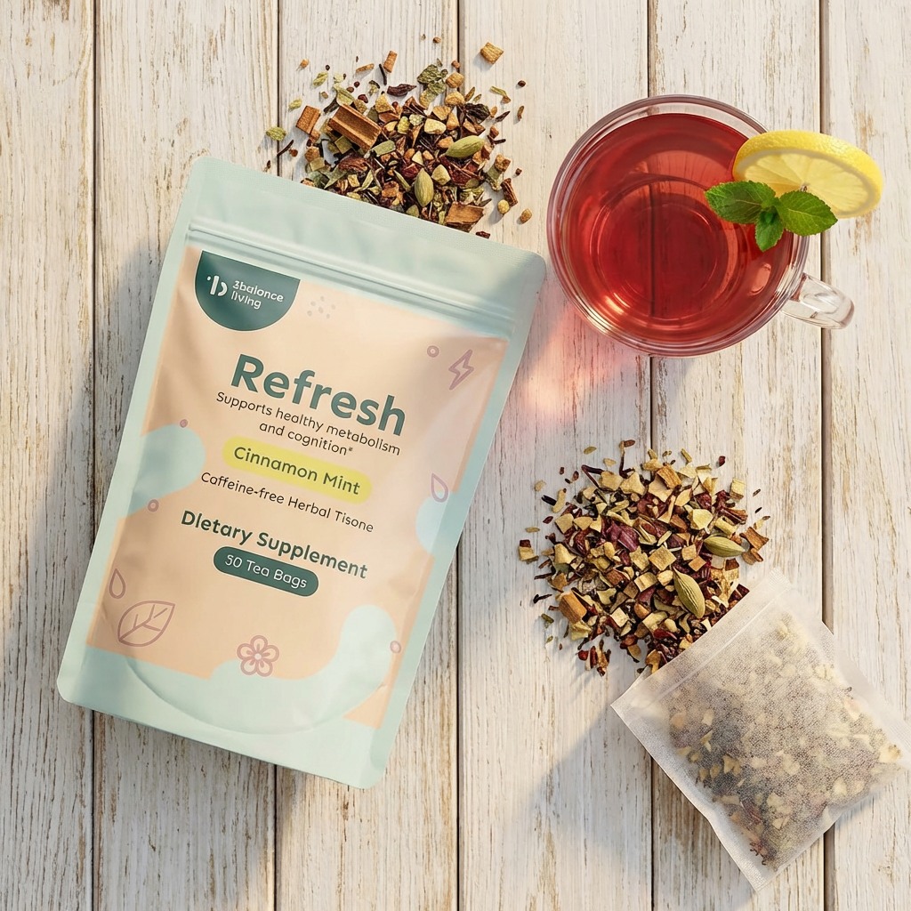 Refresh uses Eleuthero (an adaptogen) and Peppermint to naturally enhance mental clarity and alertness. Instead of a temporary caffeine spike, it helps your body manage fatigue and sharpens focus through botanical support.